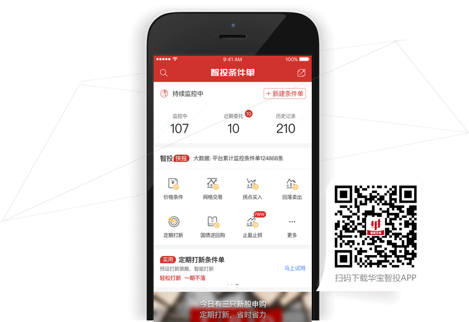 更有条件单策略交易、定期打新、余额理财等智能交易功能!